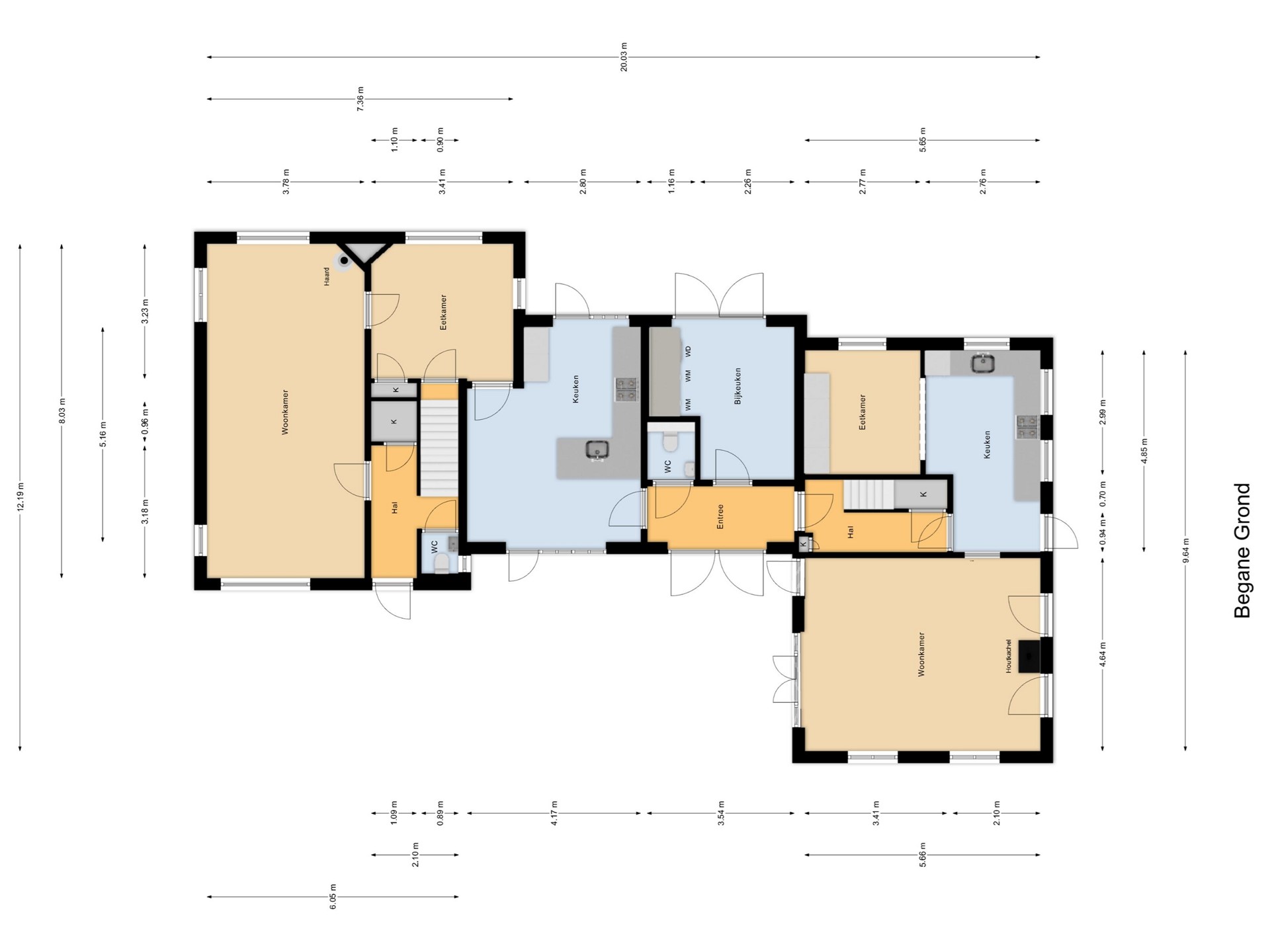 Begane grond: Entree met provisiekast, trapopgang naar de verdieping en toiletruimte v.v. wandcloset en fontein, sfeervolle woonkamer voorzien van houtkachel, eetkamer met toegang tot de kelder 2m x 2,55m, keuken welke beschikt over diverse inbouwapparatuur zoals een inductie kookplaat met 4 zones, een afzuigkap, een vaatwasser en een koelkast.