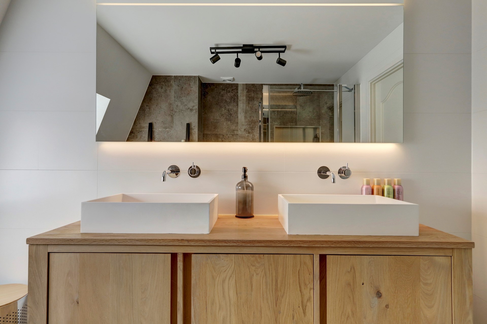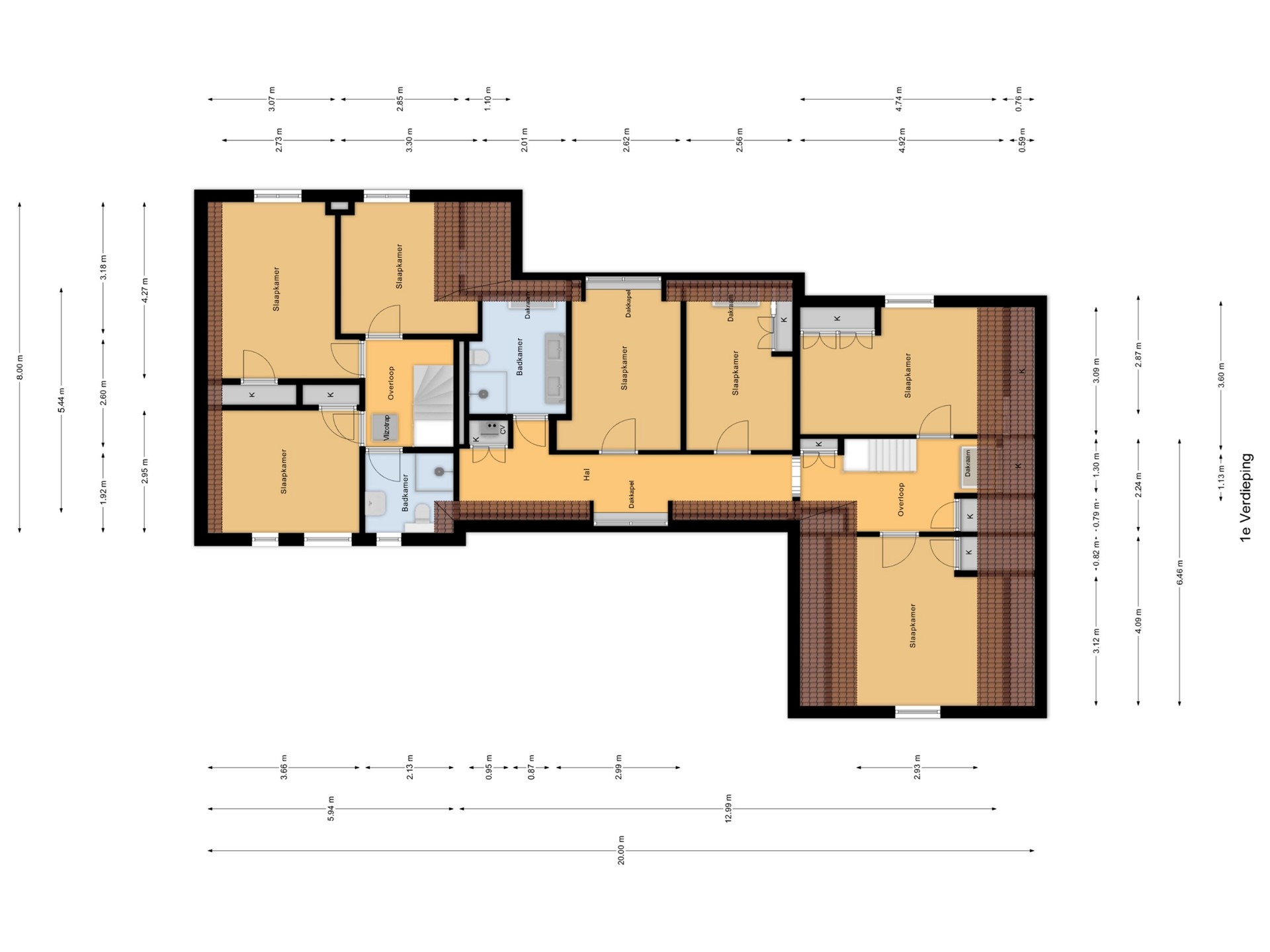 Overloop voorzien van dakkapel, 4 ruime slaapkamers waarvan 3 voorzien van vaste opbergruimte, stookruimte voor de CV en een moderne badkamer voorzien van douchecabine, toilet en dubbele wastafel.
