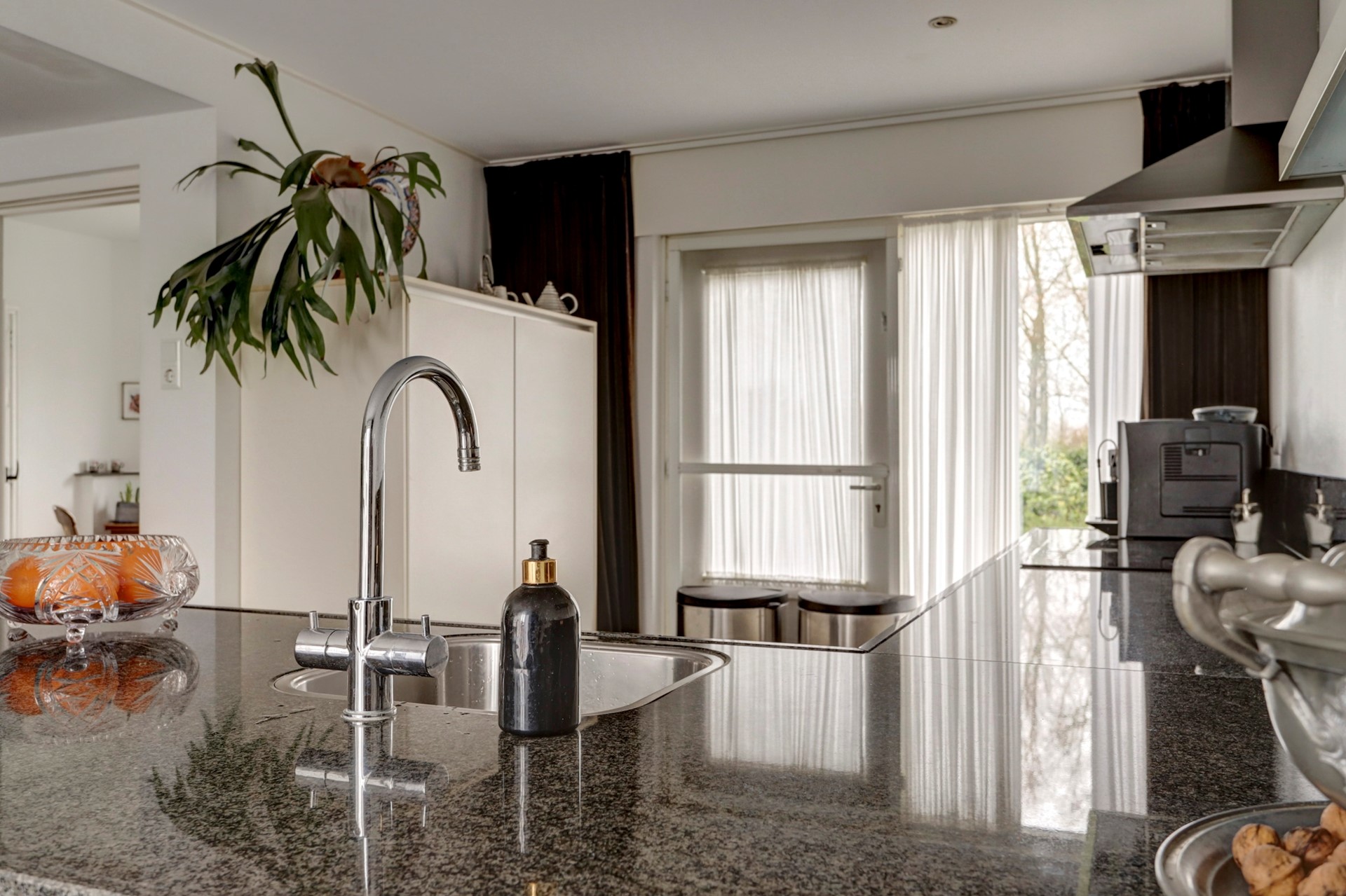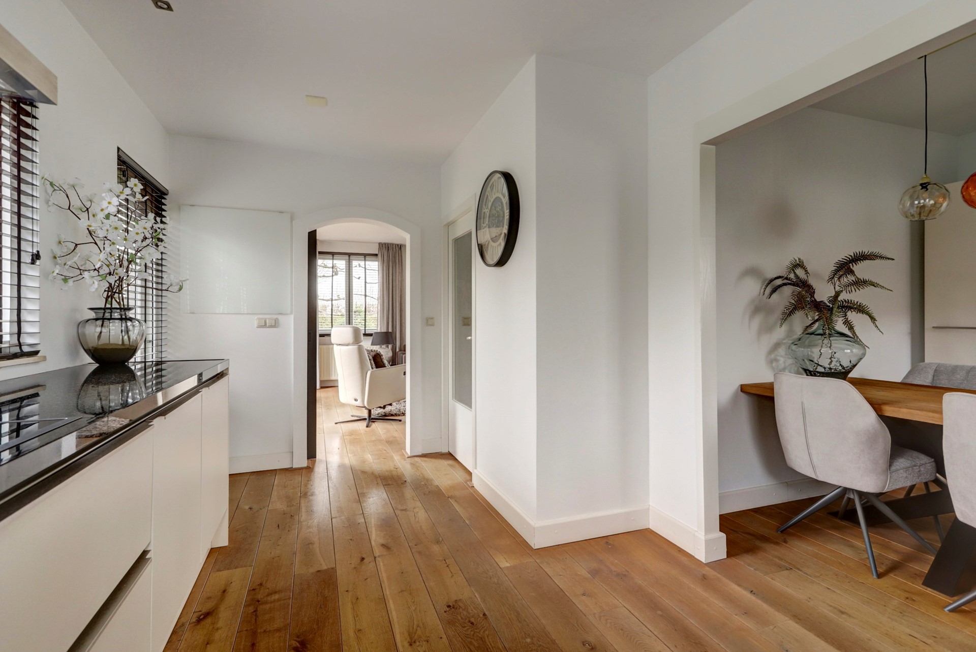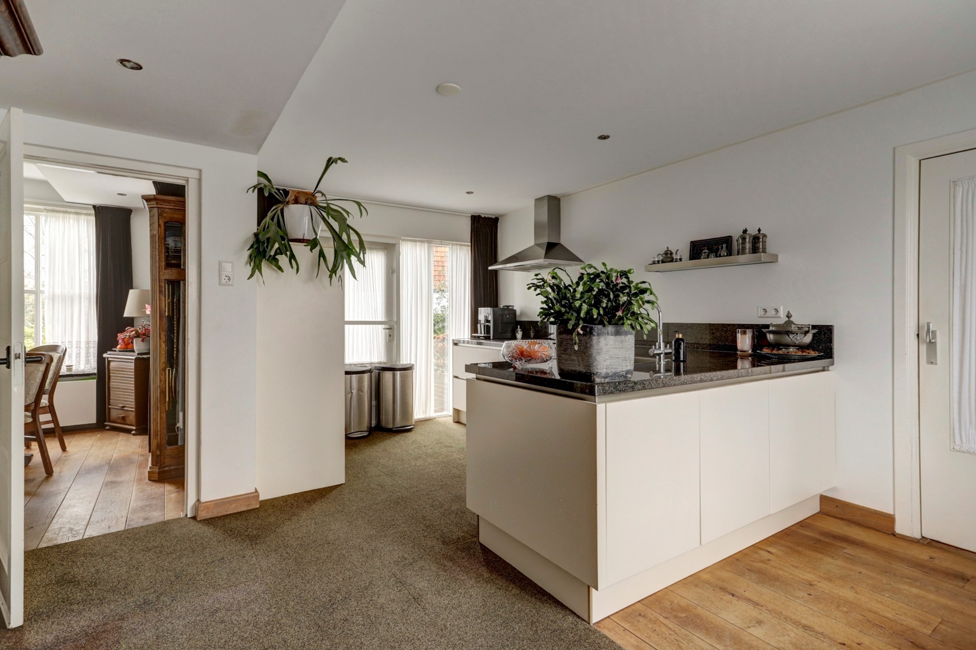 Gang naar de rechterhelft met toilet, provisieruimte, trapopgang en bijkeuken v.v. wasmachine en droger aansluiting, gezellige woonkamer met uitzicht op de tuin en voorzien van houtkachel en de woonkeuken welke beschikt over diverse inbouwapparatuur zoals een oven, een inductie kookplaat met 4 zones, een afzuigkap, een Quooker, een vaatwasser, een koelkast en een vriezer.