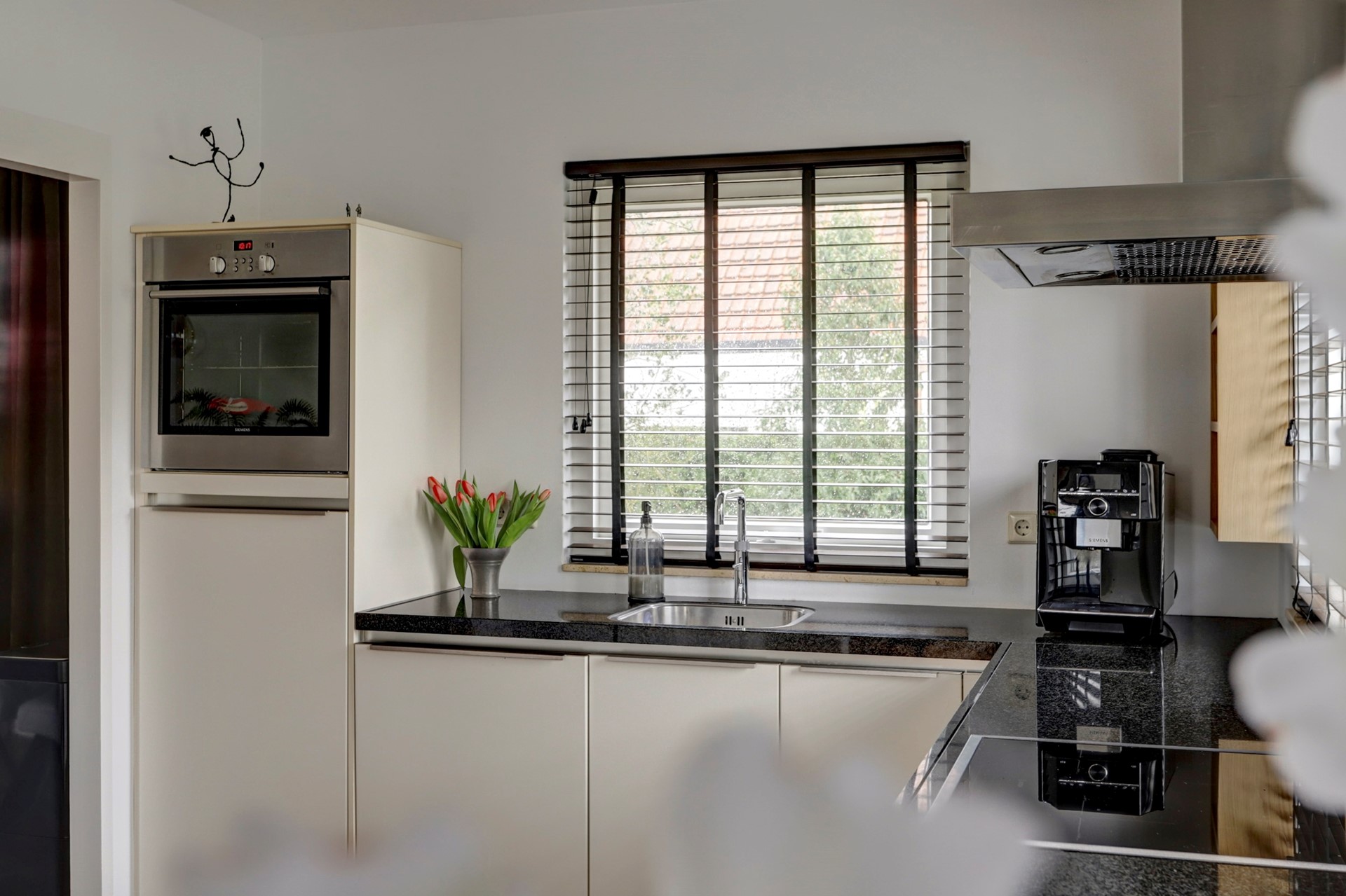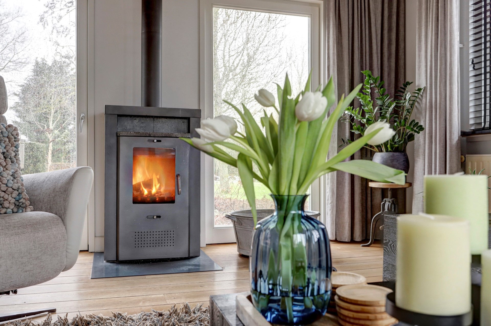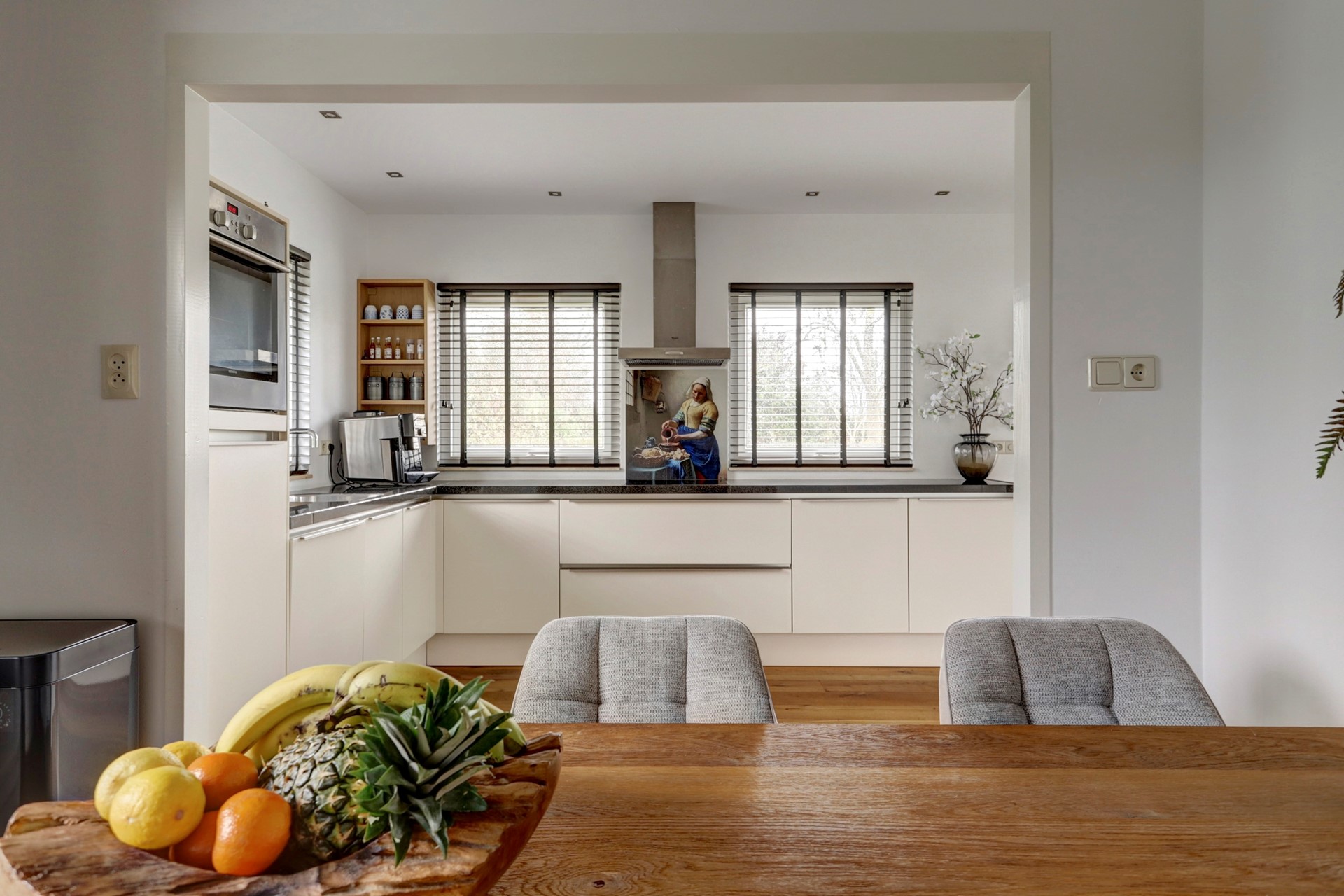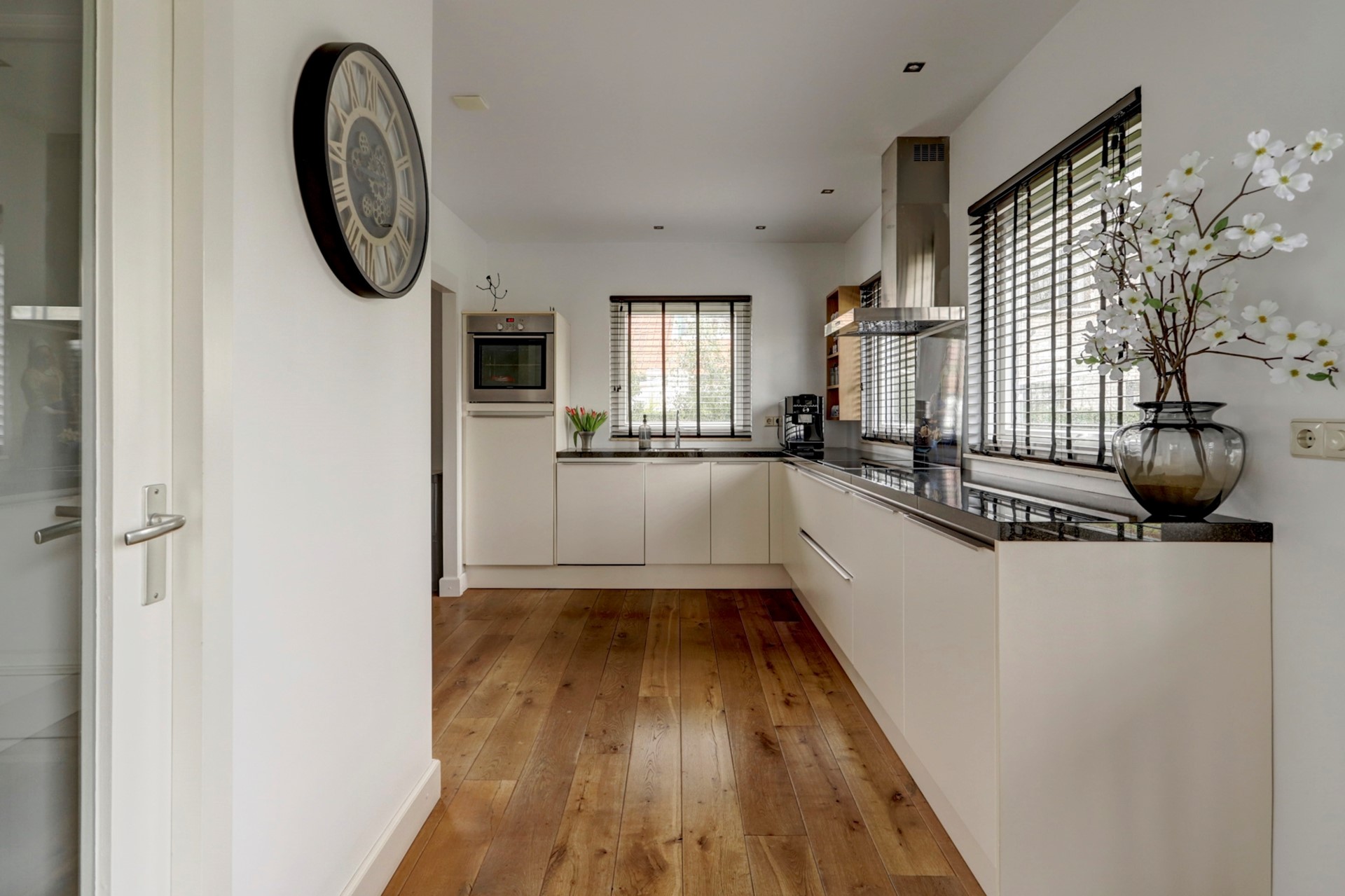 Gang naar de rechterhelft met toilet, provisieruimte, trapopgang en bijkeuken v.v. wasmachine en droger aansluiting, gezellige woonkamer met uitzicht op de tuin en voorzien van houtkachel en de woonkeuken welke beschikt over diverse inbouwapparatuur zoals een oven, een inductie kookplaat met 4 zones, een afzuigkap, een Quooker, een vaatwasser, een koelkast en een vriezer.