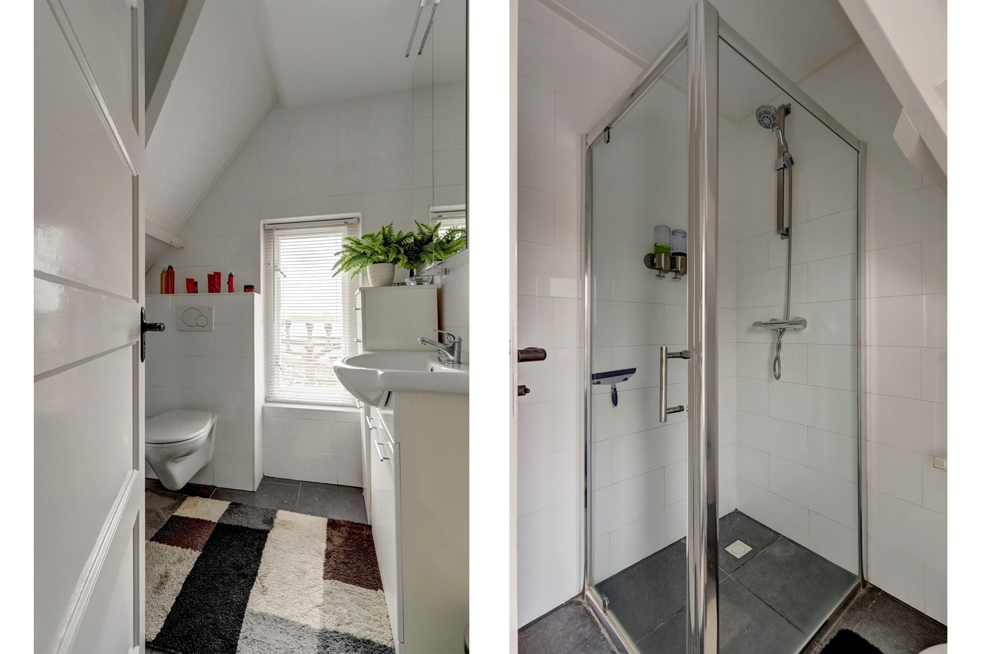 Een ruime overloop met een vlizotrap naar de bergvliering (geheel bevloerd), 3 ruime slaapkamers waarvan 2 met een vaste inbouwkast, een badkamer voorzien van douchecabine, wastafel en toilet.