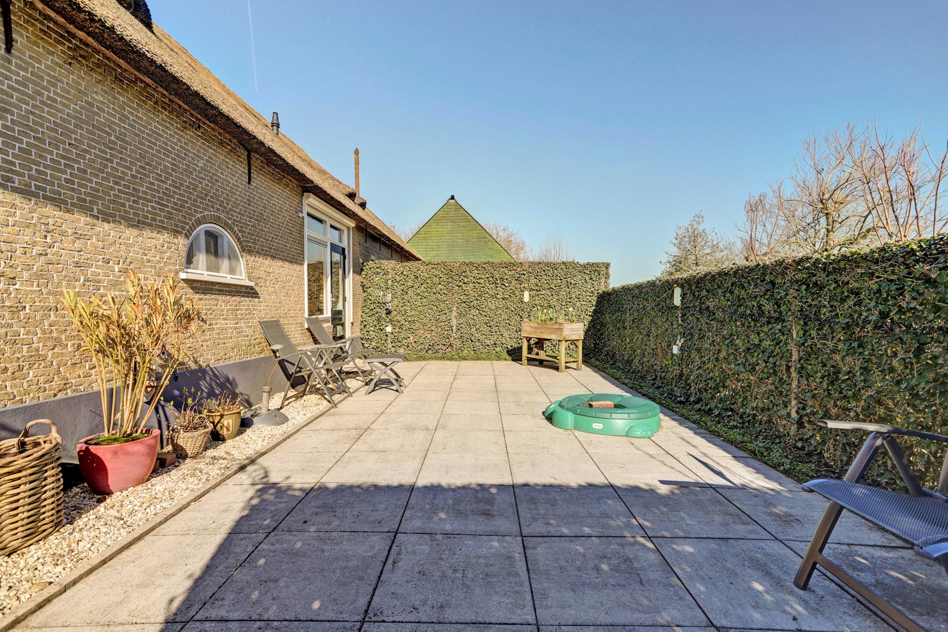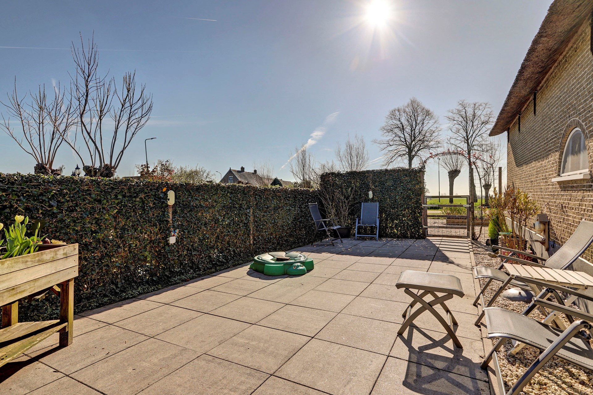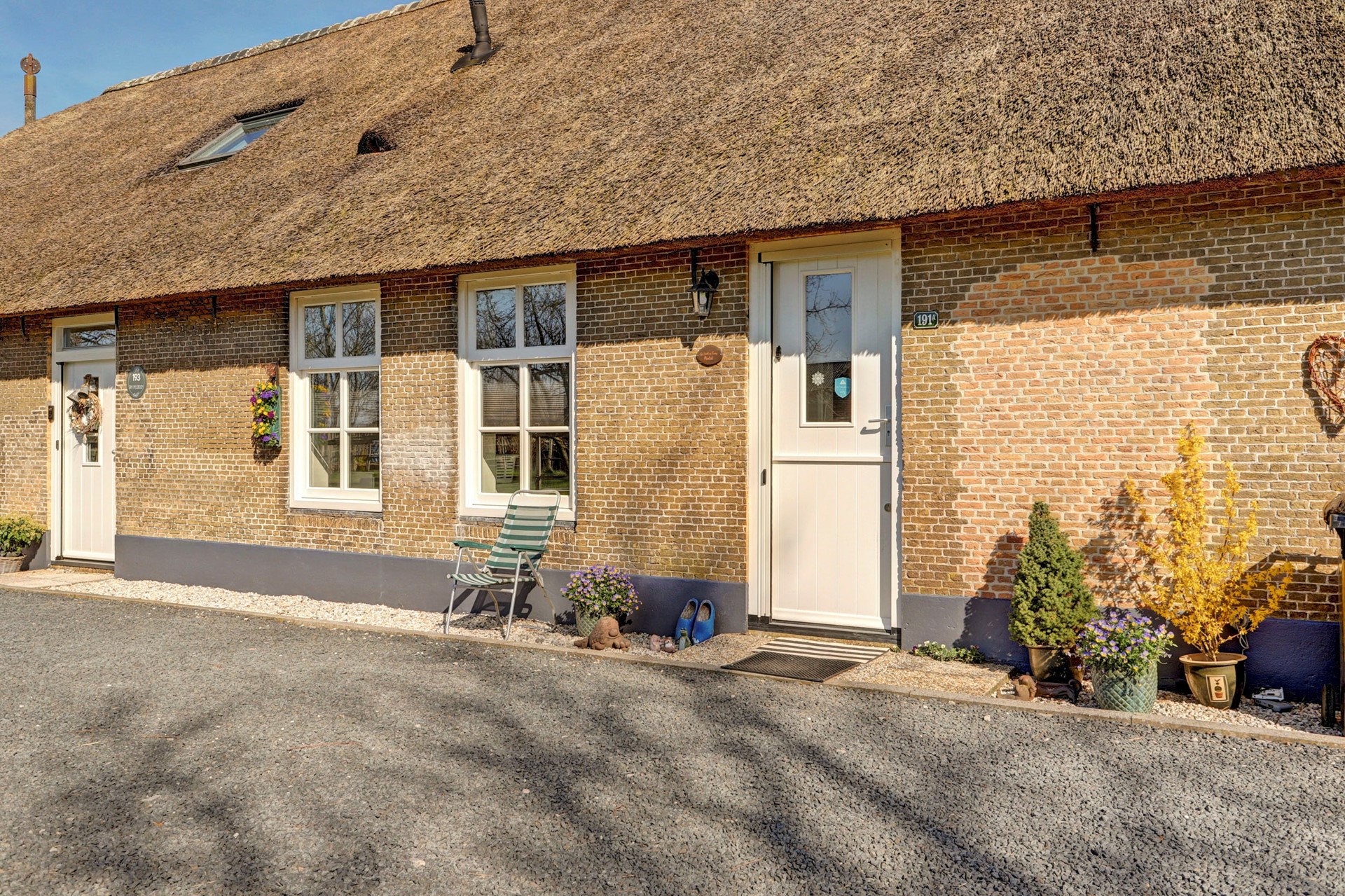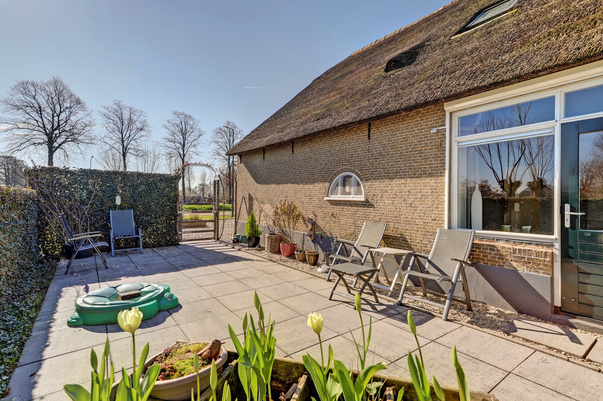 Tuin: Via een inrit met elektrisch hekwerk betreedt u het erf. Aan de oostzijde van de woning vindt u een gezellig terras, een fijne plek om ’s zomers buiten te vertoeven. De verzorgde voortuin is ingericht met grind, plantenbakken en leibomen. Aan de westzijde van de woning bevindt zich daarnaast een perceel grasland.