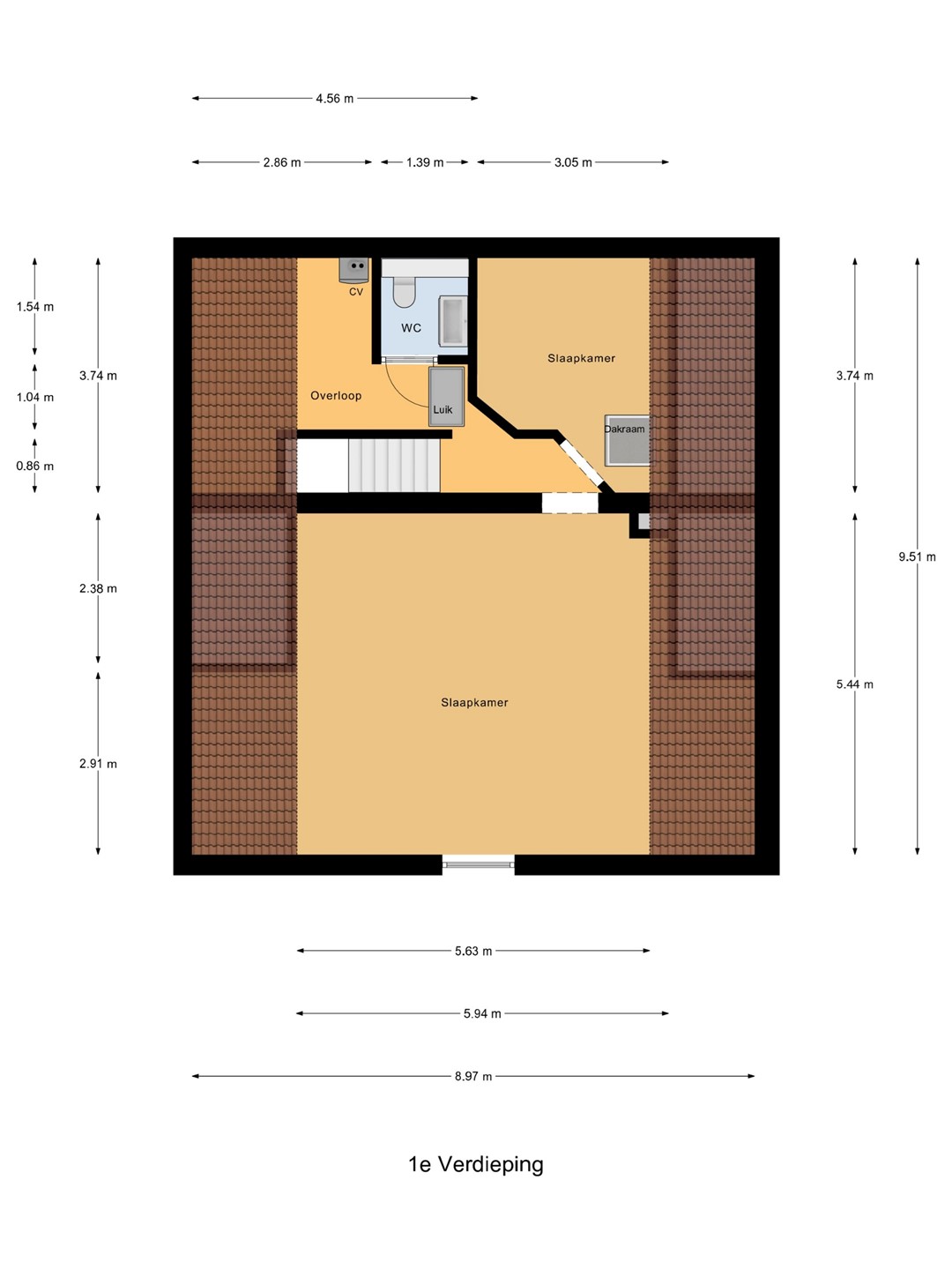 Verdieping: Op de verdieping bevinden zich een overloop met CV-installatie, een toiletruimte en twee slaapkamers, waarvan één bijzonder ruim.