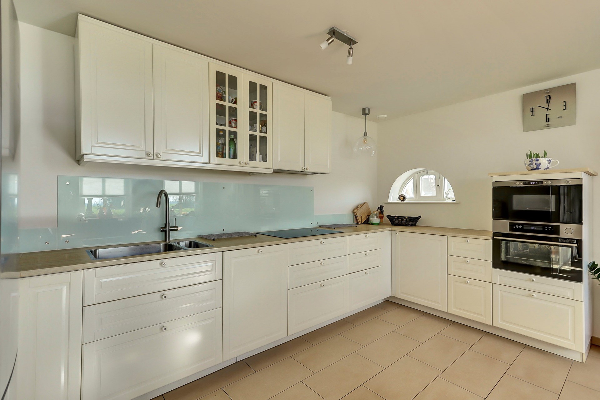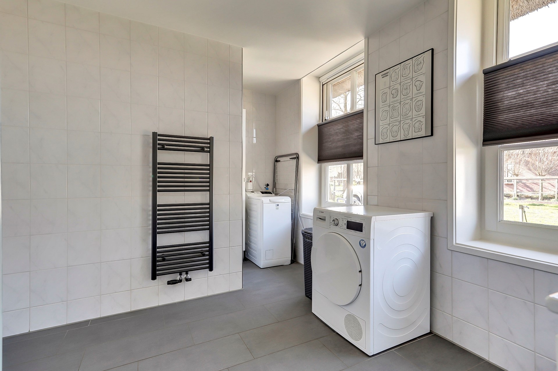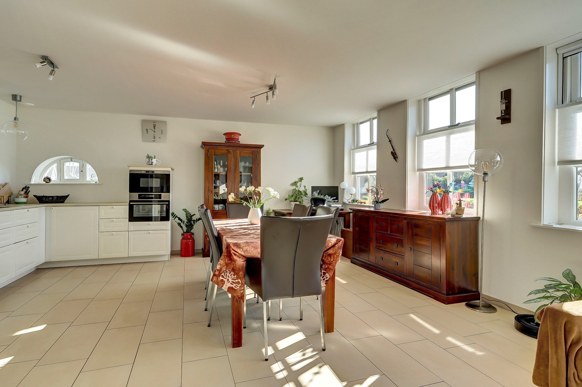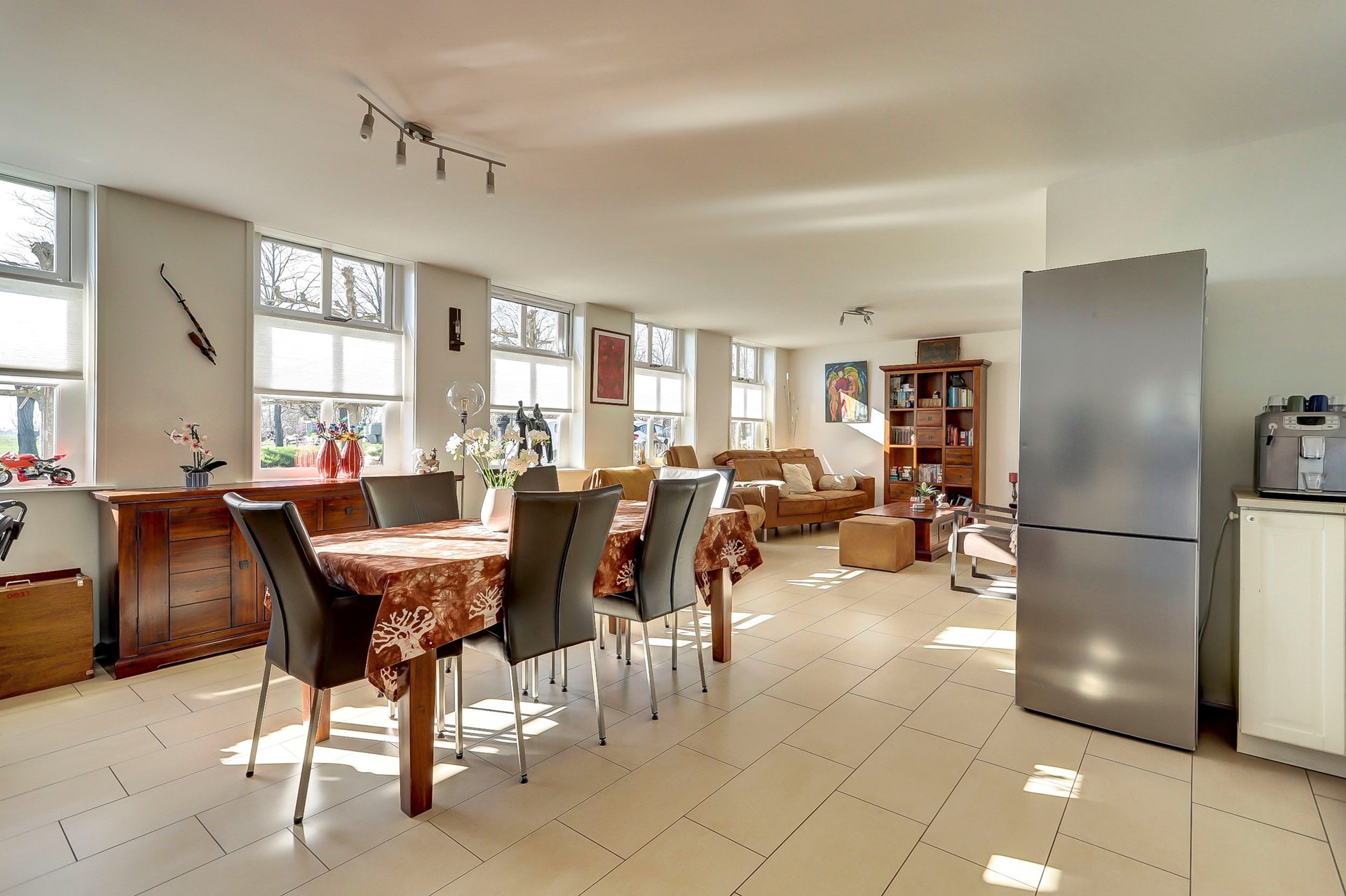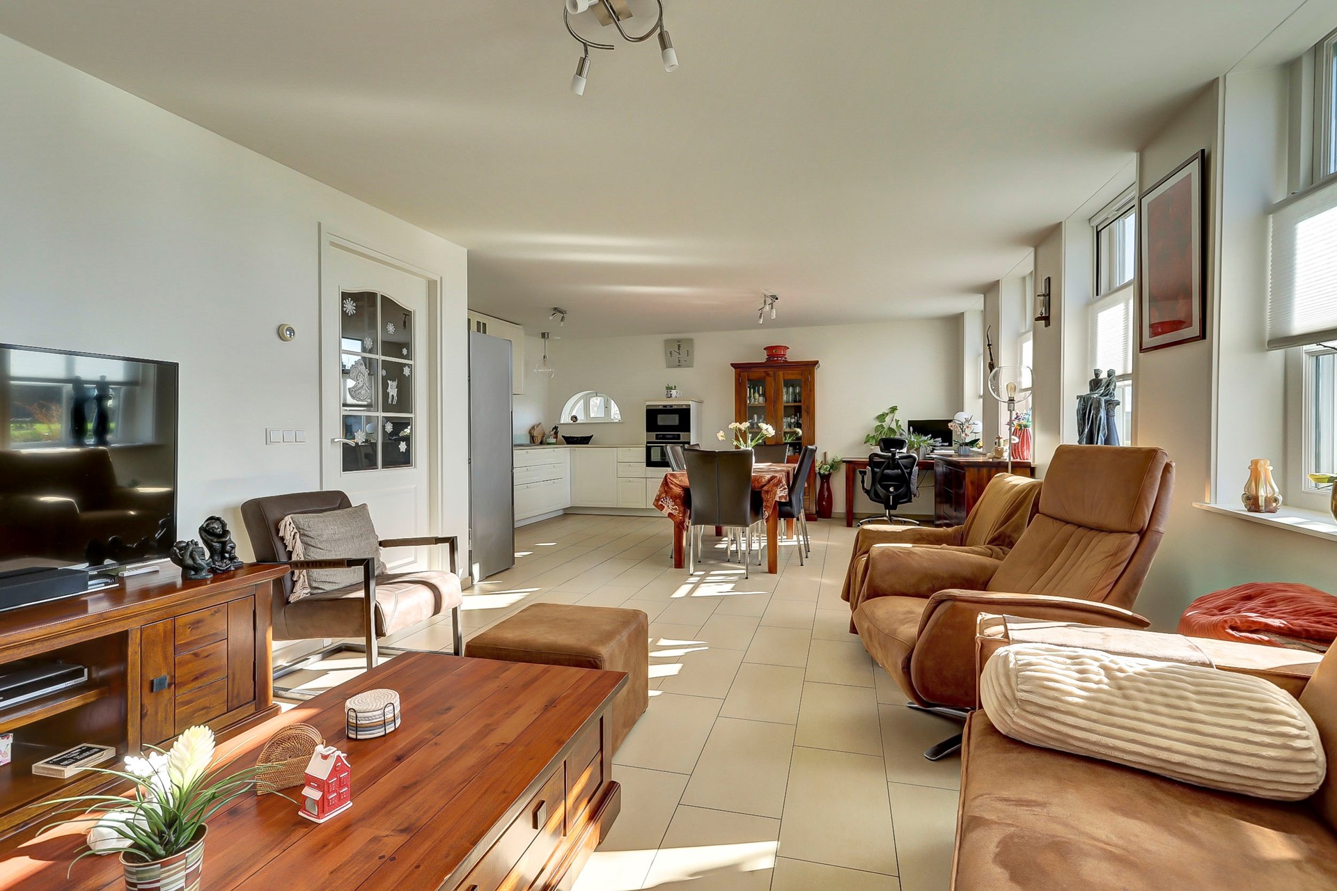 Begane grond: Bij binnenkomst wordt u verwelkomd in de ruime hal met meterkast, toilet en trapopgang naar de eerste verdieping. Aan de voorzijde van de woning bevindt zich de gezellige woonkamer, die dankzij de vele raampartijen heerlijk licht is en een prachtig vrij uitzicht over de polder biedt. De (open) woonkeuken uit 2017 is uitgerust met een 4 pits inductiekookplaat, hetelucht stoomoven, magnetron, Grohe heetwaterkraan en vaatwasser.