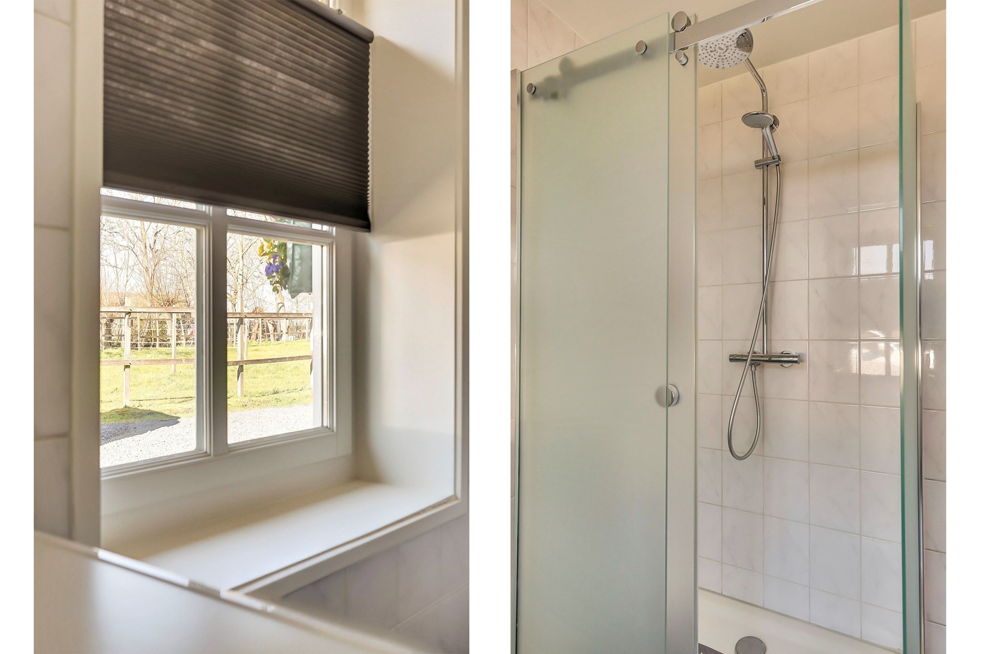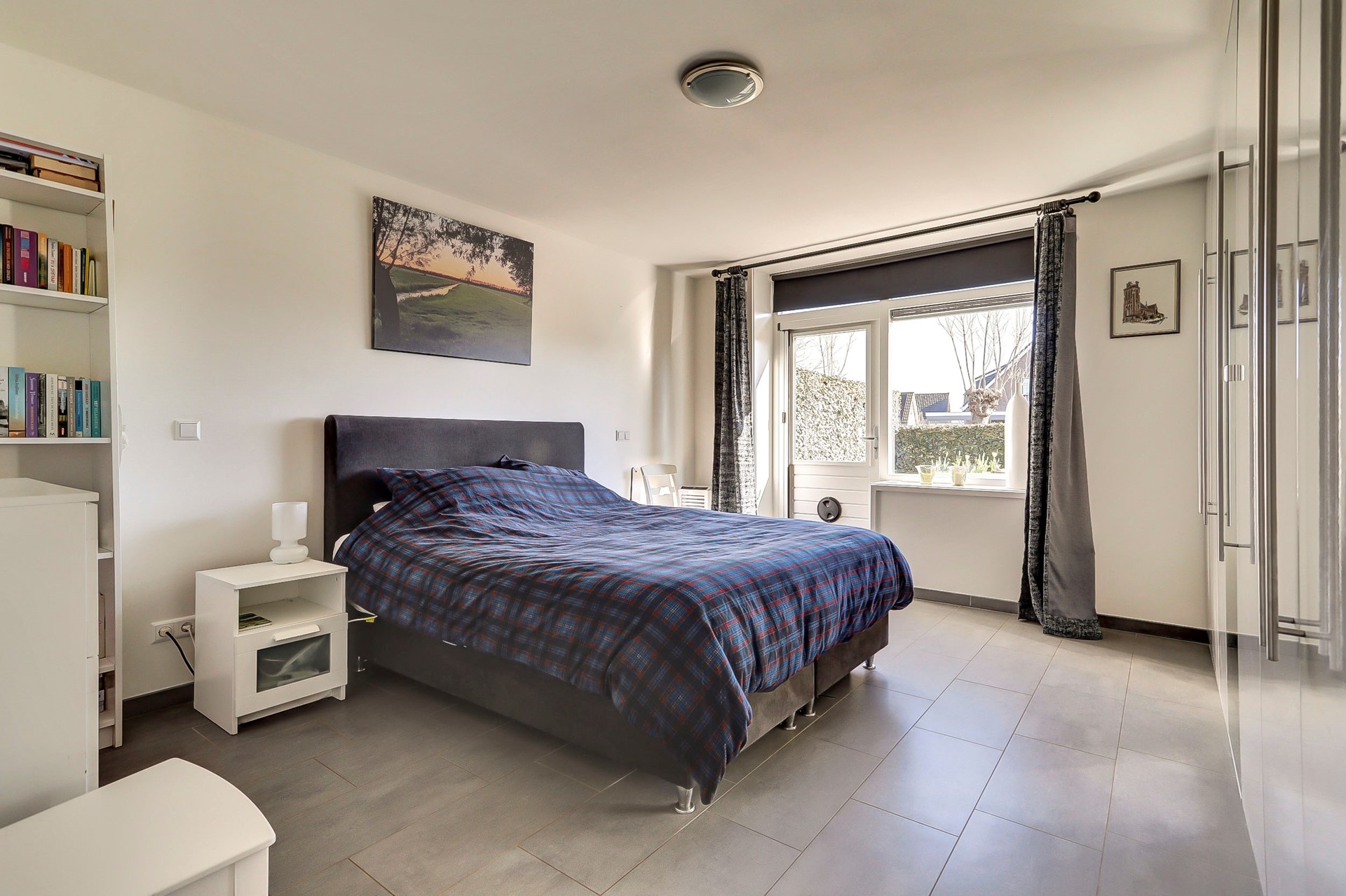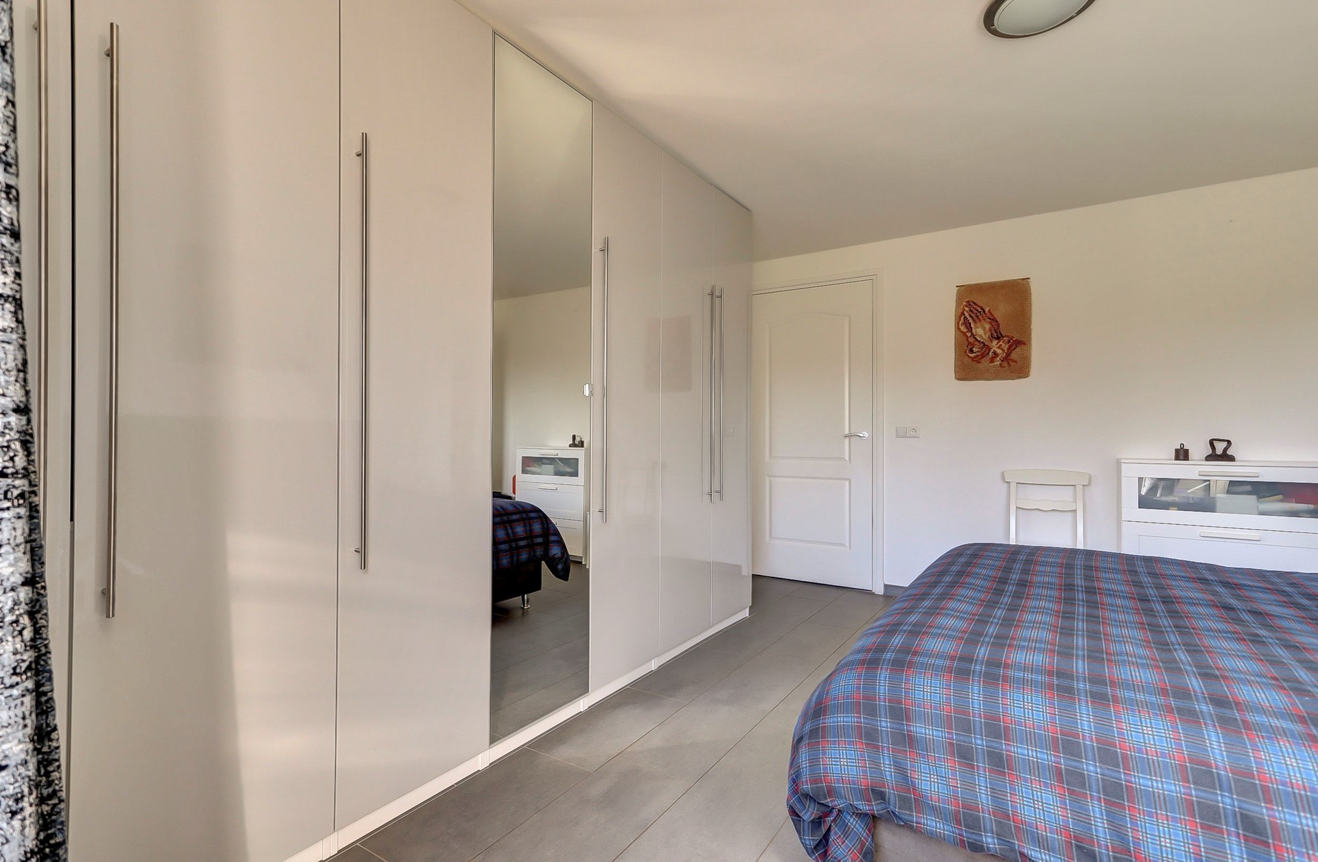 Via de hal zijn ook de ruime badkamer en slaapkamer met kastenwand bereikbaar. De nette badkamer is volledig betegeld en uitgerust met een douchecabine, wastafelmeubel, witgoedaansluiting, handdoekenradiator en vloerverwarming.