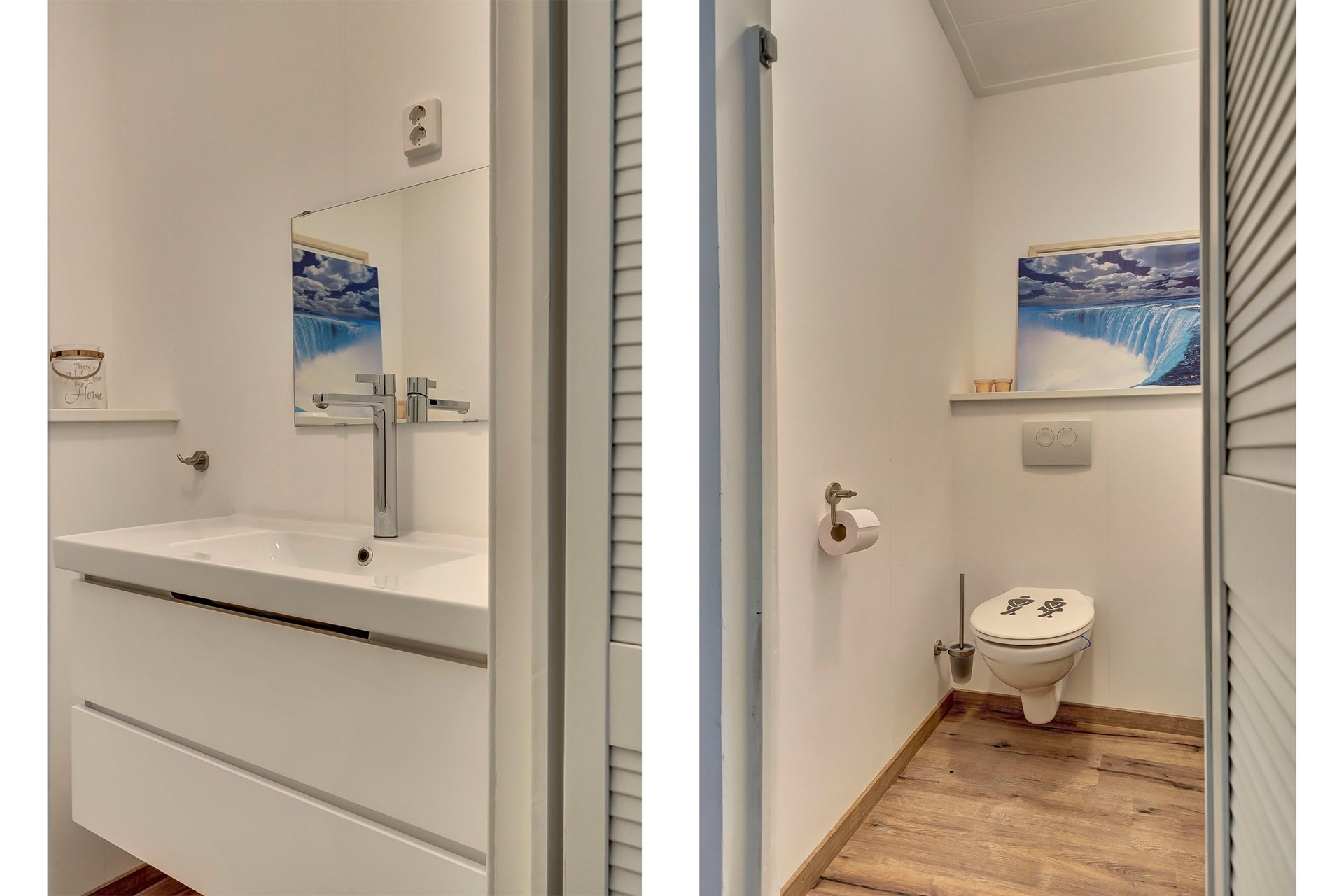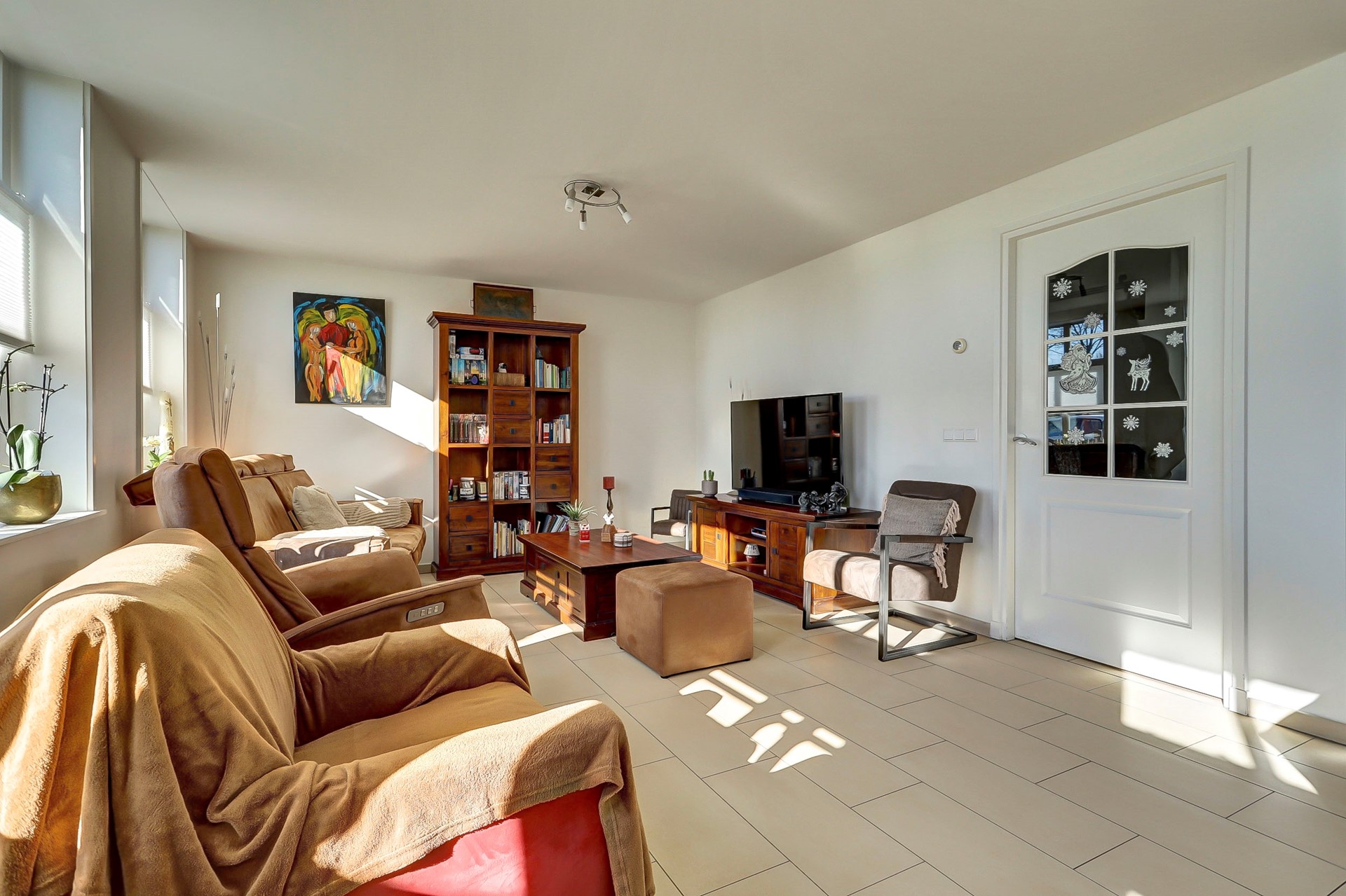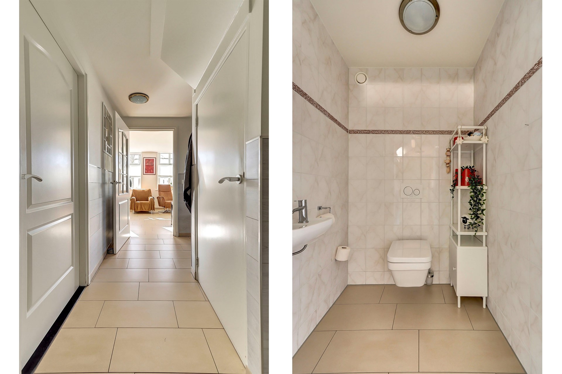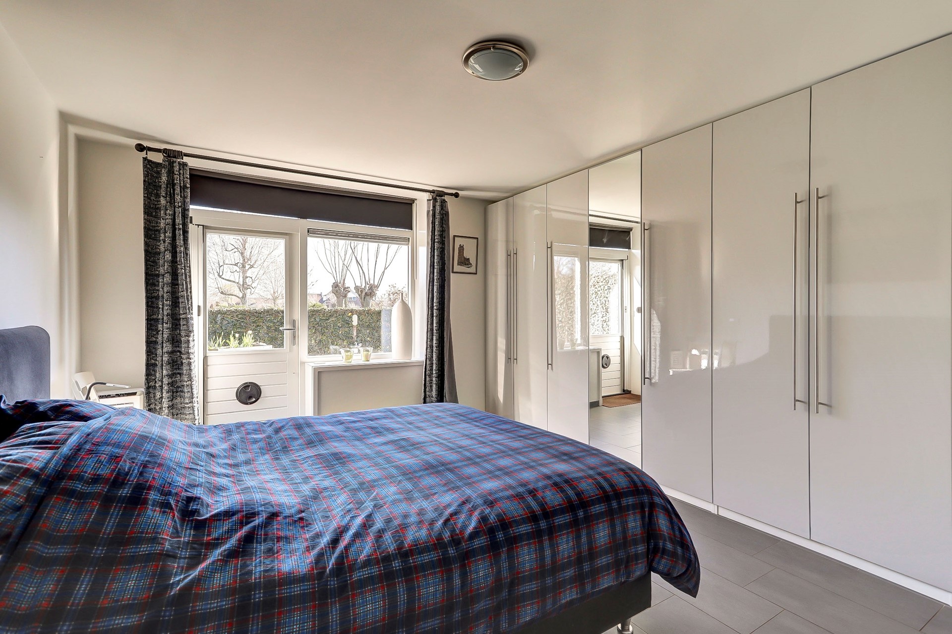 Via de hal zijn ook de ruime badkamer en slaapkamer met kastenwand bereikbaar. De nette badkamer is volledig betegeld en uitgerust met een douchecabine, wastafelmeubel, witgoedaansluiting, handdoekenradiator en vloerverwarming.