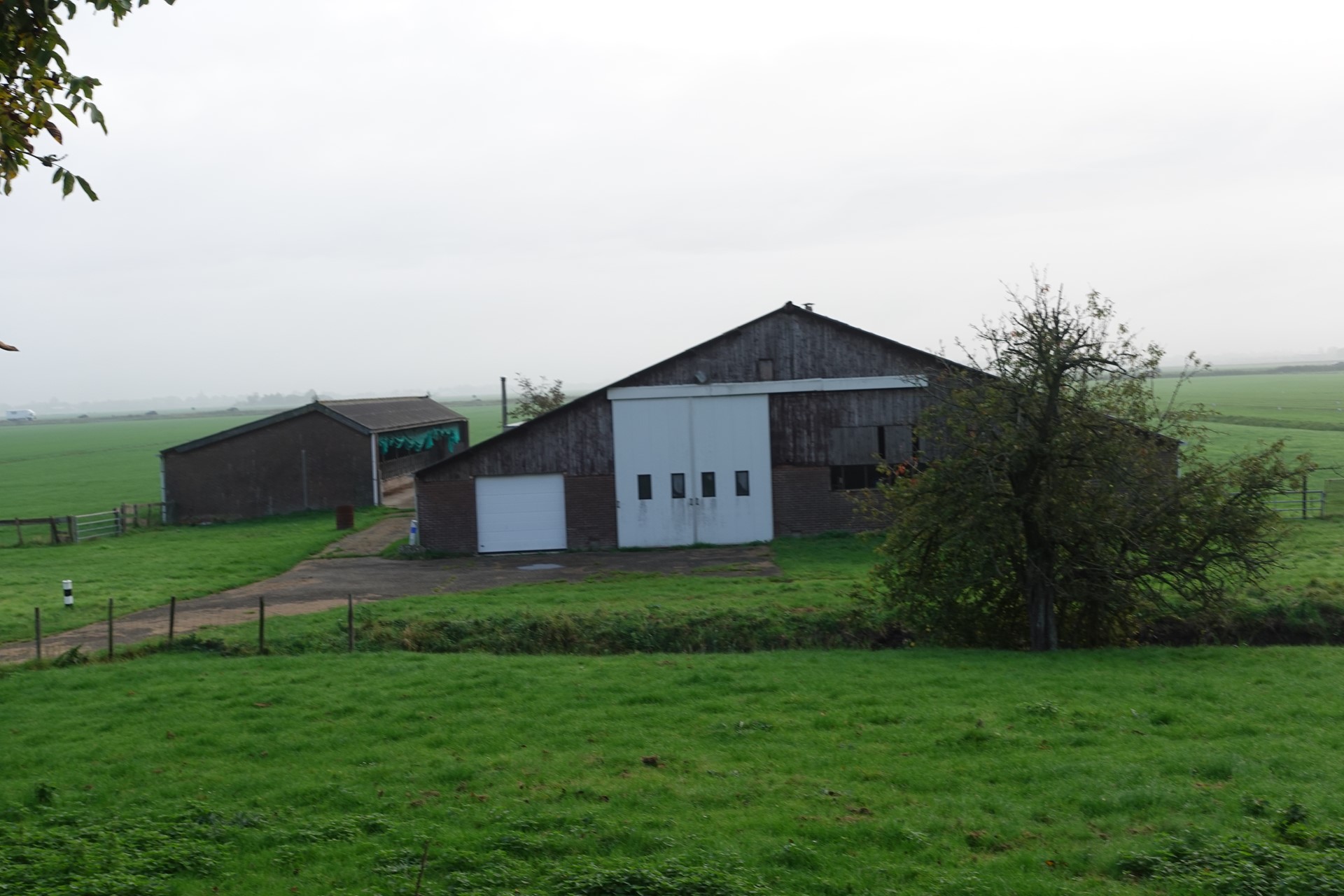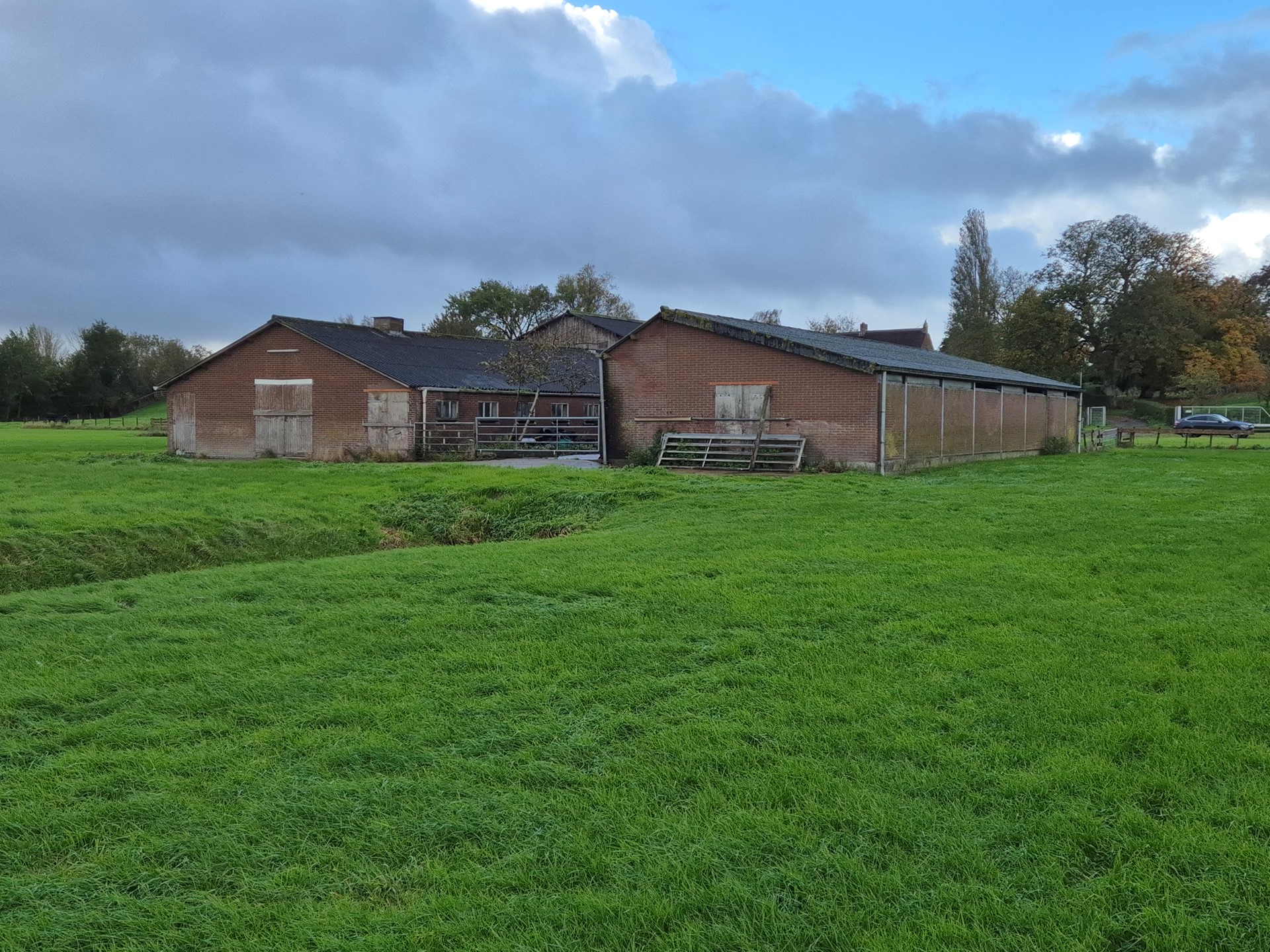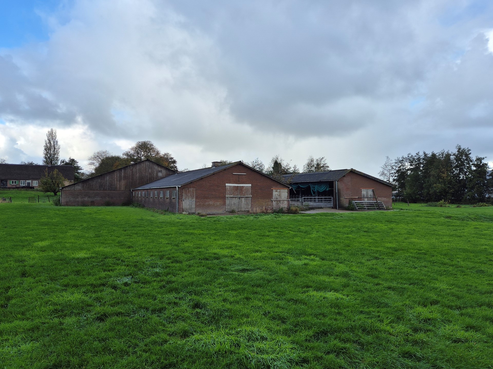Agrarisch erf bestaande uit loods, schuur, open loods (ca 800 m²), verhard terrein en gras.