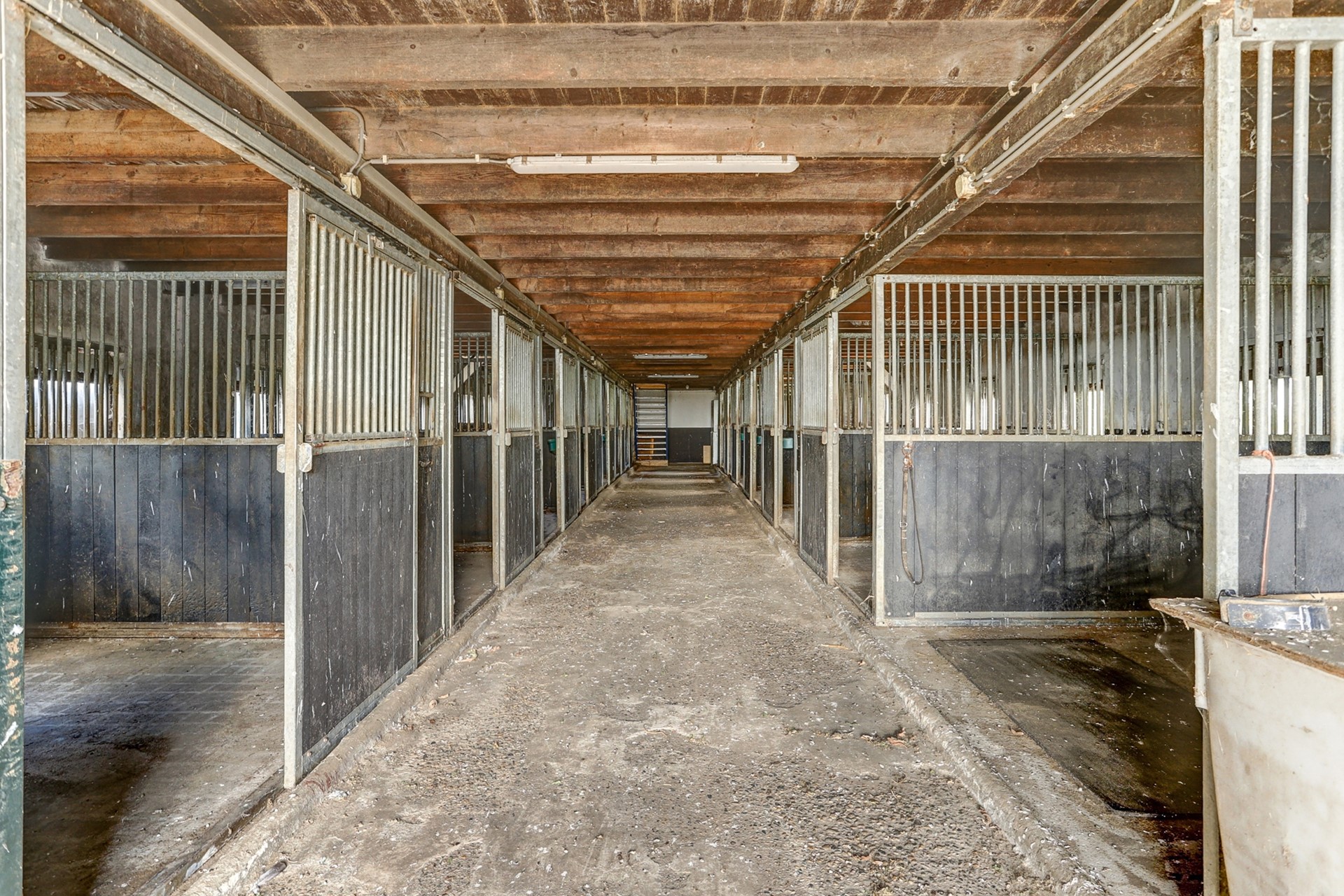 Aangebouwde schuur/stallen: Voormalige paardenstal van ca. 237 m² welke is aangebouwd aan de woonboerderij. De schuur is opgetrokken uit steen, voorzien van een betonvloer en een zadeldak met damwand profielplaten. De schuur is ingericht met 14 paardenboxen en voorzien van elektra en water. Toegankelijk via een grote schuifdeur en twee loopdeuren. De schuur beschikt over een ruime opbergzolder (met een houten verdiepingsvloer), geschikt voor diverse doeleinden.